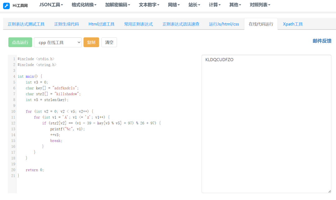 #include <stdio.h>#include <string.h>int main() {int v3 = 0;char key[] = "adsfkndcls";char str2[] = "killshadow";int v5 = strlen(key);for (int v2 = 0; v2 < v5; v2++) {for (int v1 = 'A'; v1 <= 'z'; v1++) {if (str2[v2] == (v1 - 39 - key[v3 % v5] + 97) % 26 + 97) {printf("%c", v1);++v3;break;}}}return 0;}