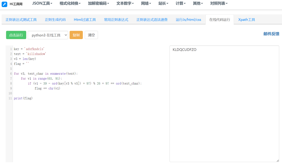 key = 'adsfkndcls'text = 'killshadow'v5 = len(key)flag = ''for v3, text_char in enumerate(text):for v1 in range(65, 91):if (v1 - 39 - ord(key[v3 % v5]) + 97) % 26 + 97 == ord(text_char):flag += chr(v1)print(flag)