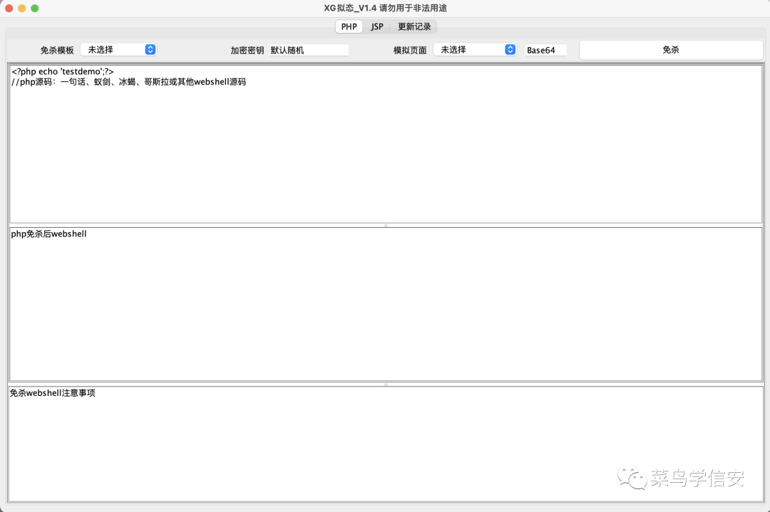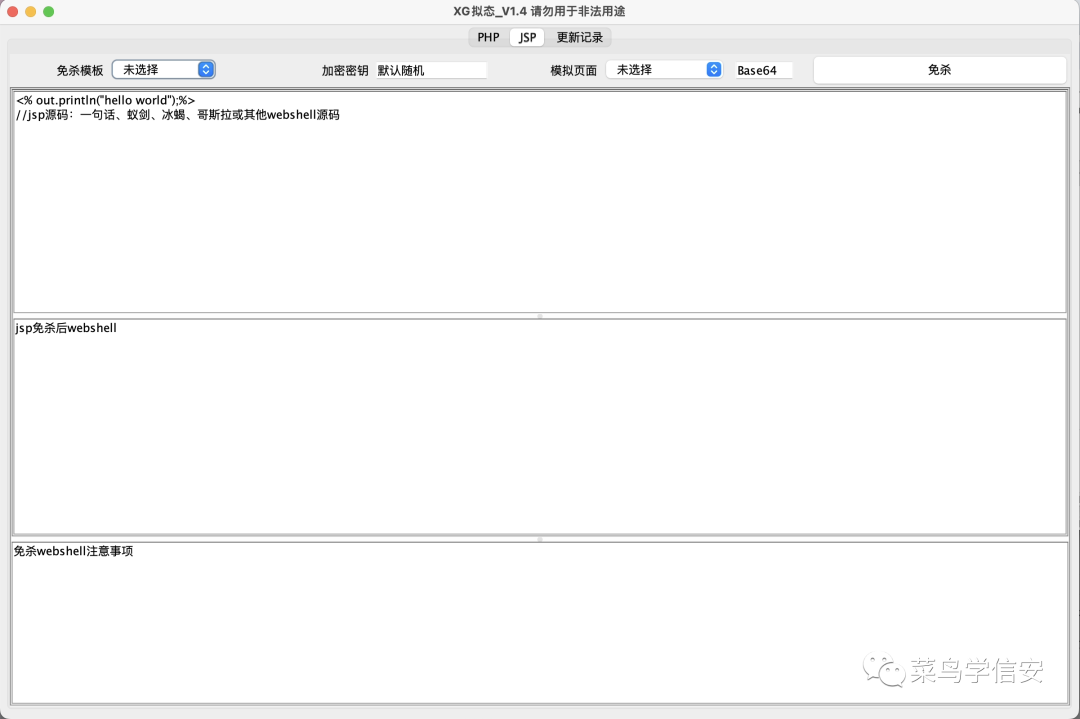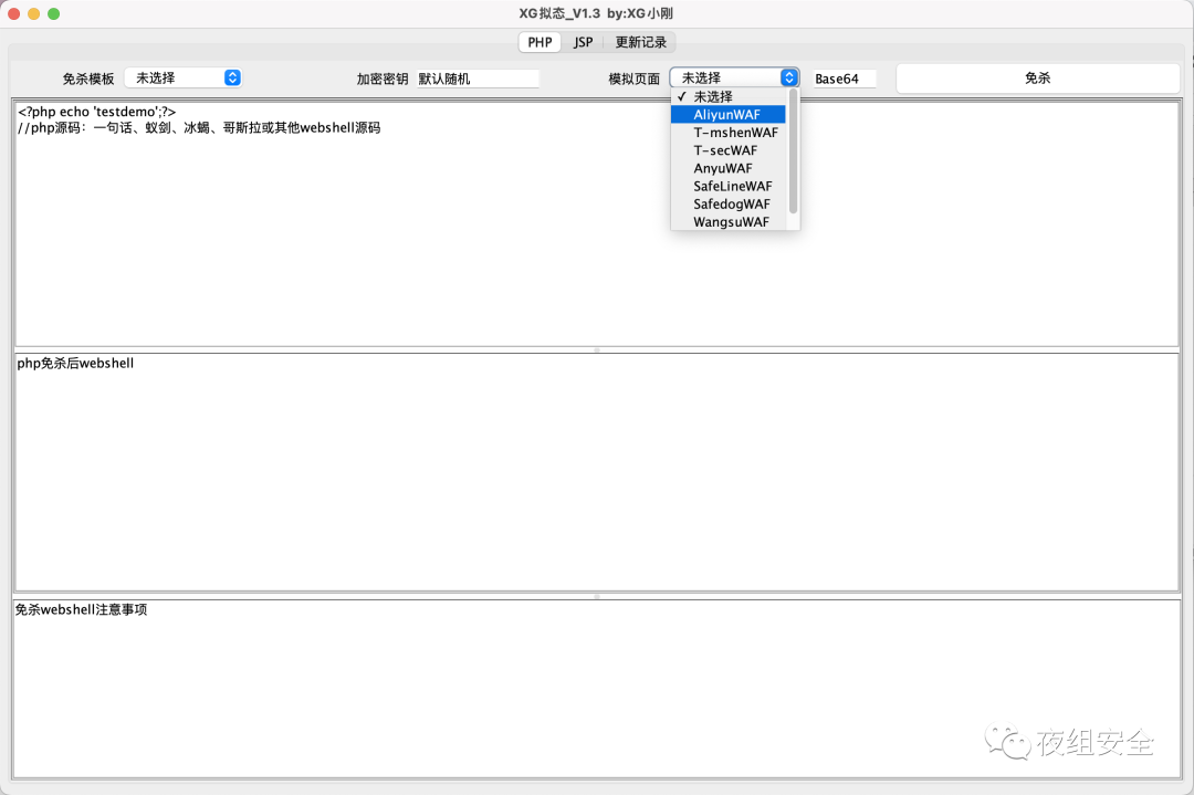 工具介绍一键免杀冰蝎、哥斯拉等webshell的php、jsp木马文件。(注:不支持流量混淆)。使用方法目前搭载6种php模板、2种jsp模板、7种waf页面(注:jsp免杀需要JAVA8)java