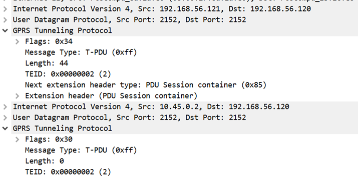 果不其然,基站将把该数据包放入到其GTP-U隧道中,发送给UPF。这导致GTP-U分组中的GTP-U到达UPF。UPF中现在有两个GTP-U分组:外部GTP-U分组报头由基站创建的,用于封装来自用户设备的数据分组。这个外部GTP-U分组的消息类型为0xFF,长度为44。这个报头是正常的。内部GTP-U报头由用户设备制作并作为数据分组来发送。与外部GTP-U分组一样,这个内部GTP-U分组的消息类型为0xFF,但长度0不正常。