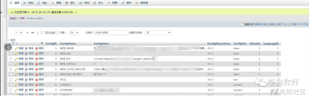 \wwwroot\Data\runtime\Data\config_cn.php文件在runtime缓存目录下,config.cn.php文件内容返回一个数组,想到把文件里面的seo内容给删掉看看网站会不会恢复正常。结果删除相应内容后访问网站还是会发生跳转,继续分析可能是网站配置被修改,打开数据库查找相关的config表进行排查: