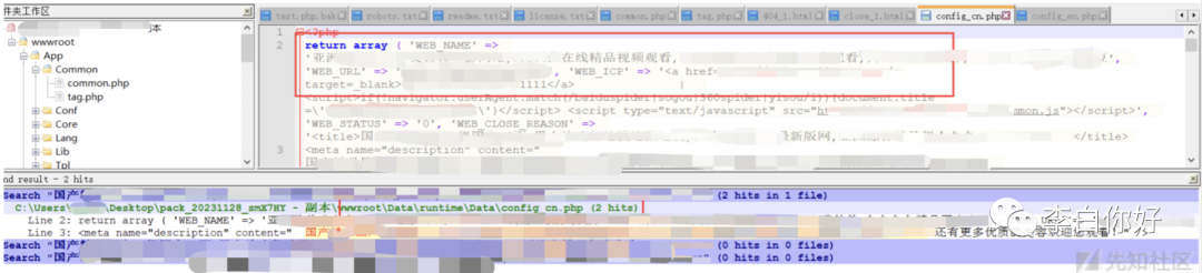 对整个目录都进行搜索(大佬们有没有更好的搜索工具推荐),搜索结果显示整个网站源码文件中只有一个文件被修改 :