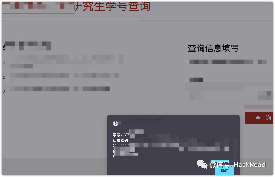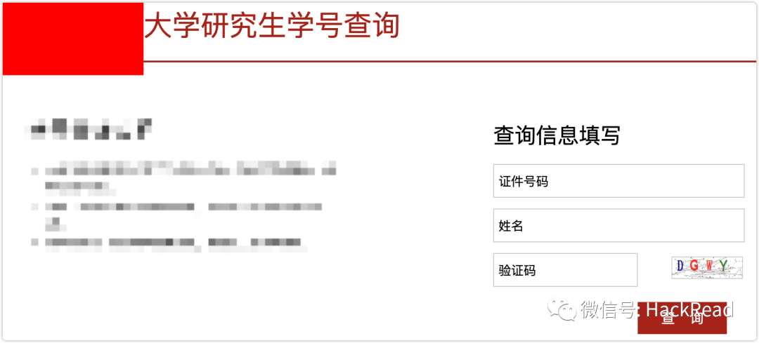 但是目标高校正值开学季,开放了一个研究生学号的查询系统,可以使用研究生的sfz+姓名 查询学号和初始密码