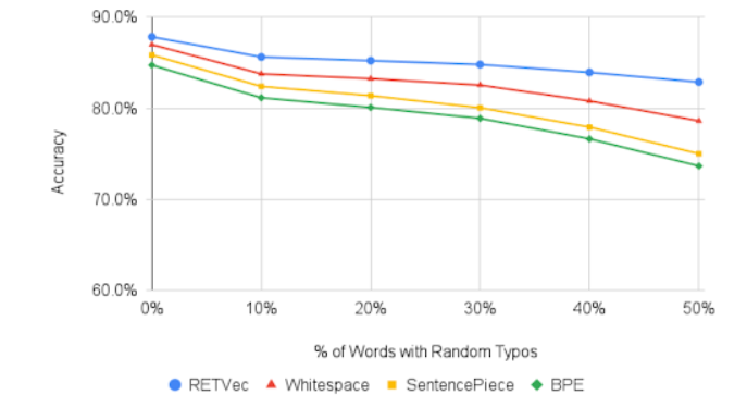 RETVec提出一种新型架构,融合了高度紧凑的字符编码器、增强驱动的训练和度量学习(Metric Learning)。RETVec可以应用于不同语言和所有UTF-8字符,无需进行文本处理,使得其适用于设备级、网页级和大型文本分类部署。使用RETVec训练的模型具有更快的推理速度。