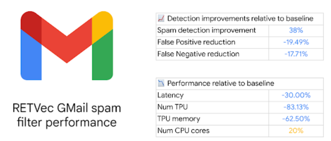 近年来,谷歌将RETVec广泛应用于谷歌的安全和反滥用应用中以评估其有用性和有效性。用RETVec替换Gmail垃圾邮件分类器之前使用的文本向量化器可以将垃圾邮件检测准确率在基准上改进38%,将假阳性减少19.4%。此外,使用RETVec将模型的TPU使用减少83%。