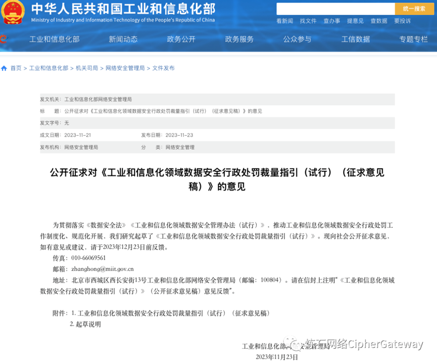 11月23日,为贯彻落实《数据安全法》《工业和信息化领域数据安全管理办法(试行)》,推动工业和信息化领域数据安全行政处罚工作制度化、规范化开展,工业和信息化部网络安全管理局研究起草了《工业和信息化领域数据安全行政处罚裁量指引(试行)》,现向社会公开征求意见。