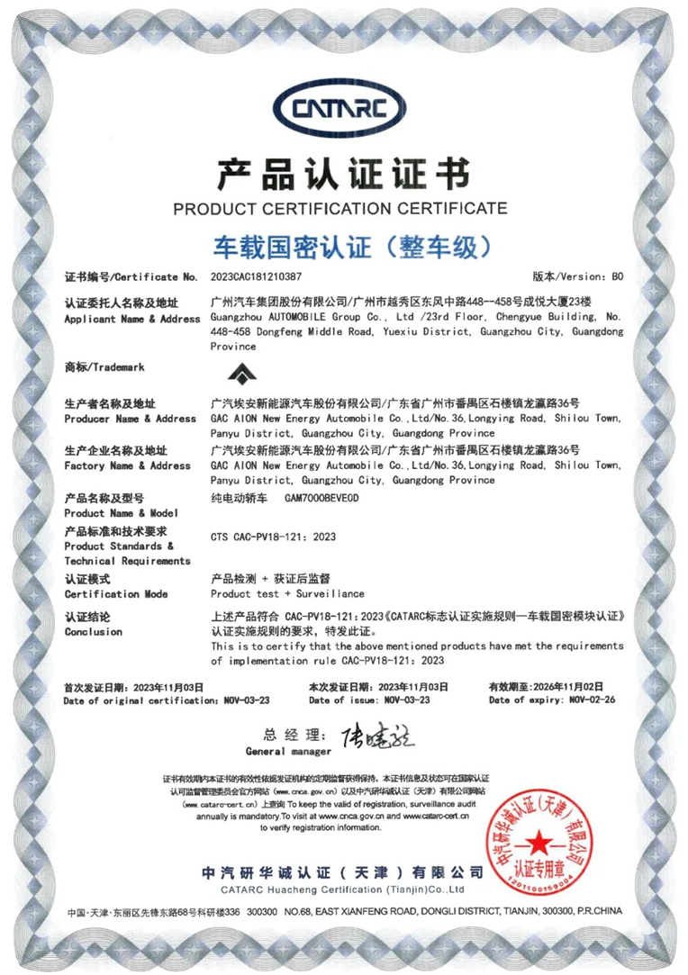11月13日,由广汽研究院自主研发的车载国密模块顺利通过中汽研华诚认证(天津)有限公司认证,获颁“车载国密认证(整车级)”证书。此举标志着广汽成为全国首家落地全链路国密方案的车企,昊铂GT成为全国首款获得车载国密模块认证的车型。