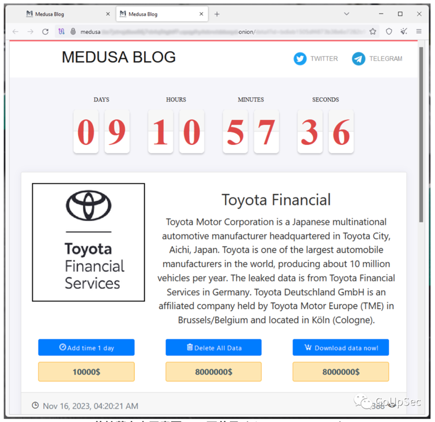 Medusa勒索软件组织在其暗网数据泄漏站点的受害者名单中添加了丰田金融服务公司,要求后者支付800万美元赎金来删除泄漏数据(下图):