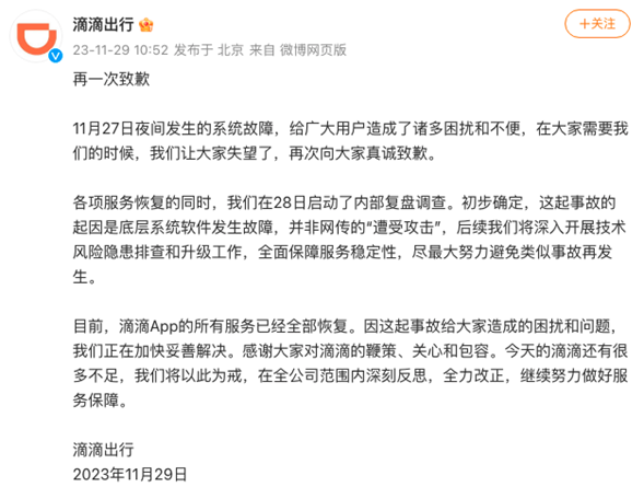11月29日,@滴滴出行 发文就11月27日夜间发生的系统故障再次致歉,同时表示,初步确定,这起事故的起因是底层系统软件发生故障,并非网传的“遭受攻击”,后续公司将深入开展技术风险隐患排查和升级工作,全面保障服务稳定性,尽最大努力避免类似事故再发生。目前,滴滴App的所有服务已经全部恢复。因这起事故给大家造成的困扰和问题,公司正在加快妥善解决。