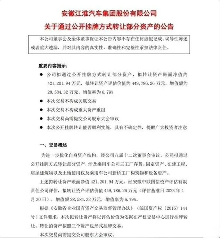 在今年10月底,江淮汽车发布公告,公司拟通过公开挂牌方式转让部分资产。涉及乘用车公司三工厂存货、固定资产、在建工程、房屋建筑物以及土地使用权及乘用车公司新桥工厂构筑物和设备资产,拟挂牌价为44.98亿元,增值额为2.86亿元,增值率为 6.79%。据知情人士透露称,此次涉及的江淮汽车资产转让的两家工厂,实际上就是江淮与蔚来合作的两座工厂,即蔚来F1工厂和蔚来F2工厂。