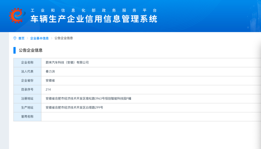 12月4日,工信部车辆生产企业信用信息管理系统显示,蔚来汽车科技(安徽)有限公司获得独立生产资质,生产地址为安徽省合肥市经济技术开发区白塔路299号,法人代表为秦力洪。