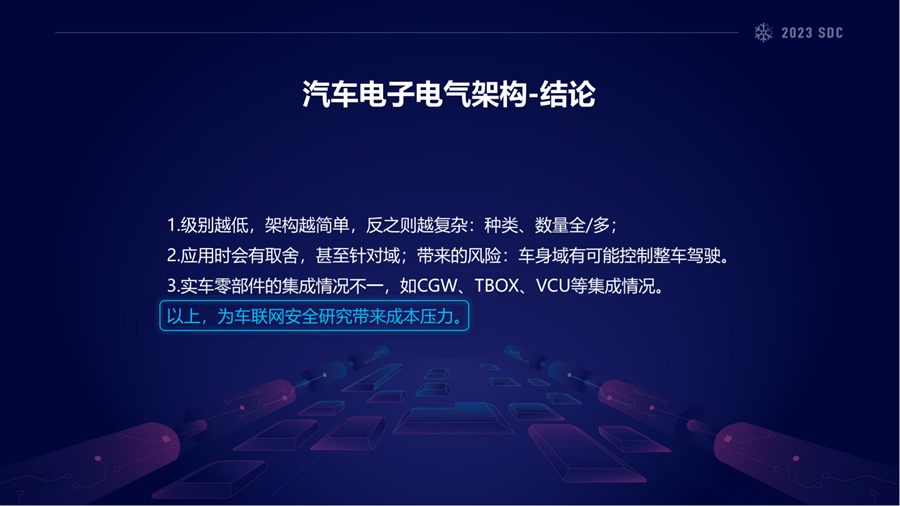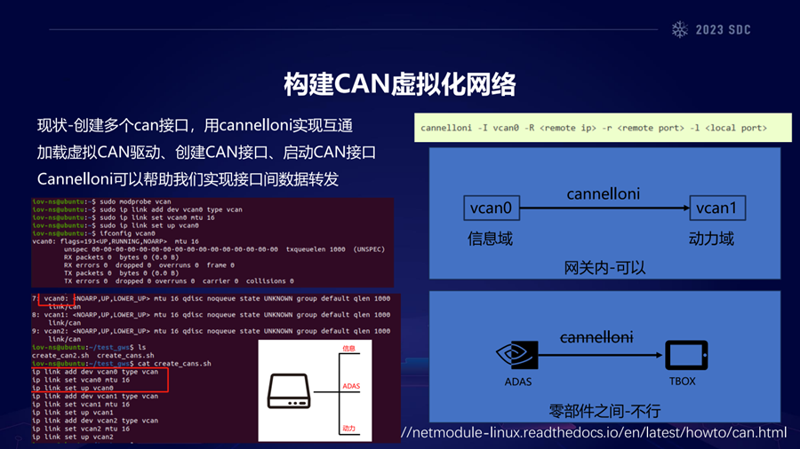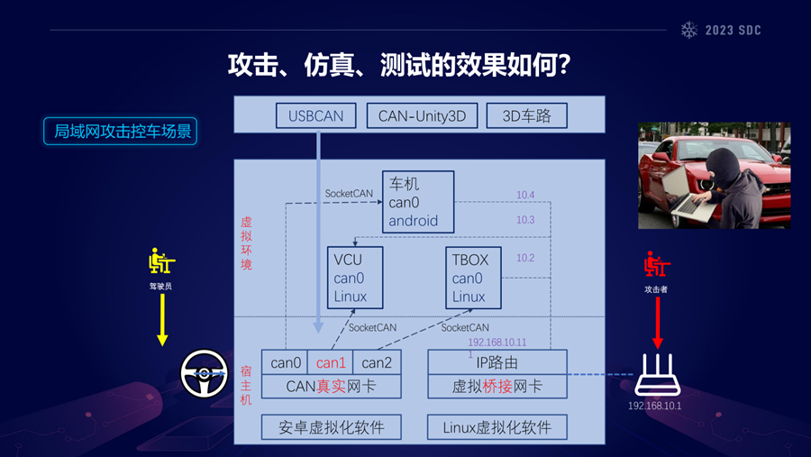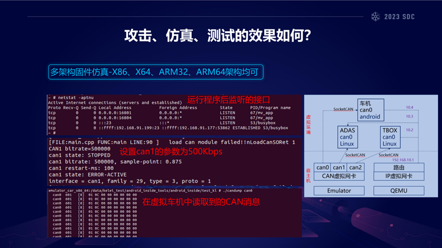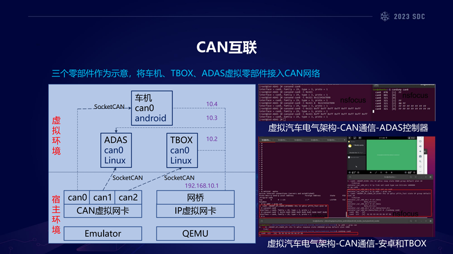 大家好,我是绿盟科技的张克雷。今天的议题是汽车的虚拟化技术,他能降低大家的研究成本,我们愿意分享出来,希望能助力整个车联网安全行业蓬勃发展。核心内容有6大块,因为虚拟化这东西比较玄,所以尽可能的说大白话,让大家都能理解。第一个就是说它难在哪,这个问题等我讲完所有内容以后,大家心里才有底。第二就是说我们怎么做虚拟化的技术验证,会花费将近2/3的篇幅来给大家公开这个技术。第三就是如何基于这一套虚拟化技术,形成一个比较合理的或非常合理的虚拟化的汽车系统。第四,我们对这一套虚拟化的汽车系统进行攻击,基于它做一些仿真,然后再去做一些产品测试,最后它的效果怎么样。第五个就是还有一些虚实结合的东西,我们说一说自己的理解。第六,有没有另外的玩法,就把它玩起来可能会更让大家的研究会更有趣一点。这里有些名词,比如说电气架构,它就是一个汽车行业的名词,他说的是啥?就是汽车各个零部件应该怎么连的问题,怎么连能降低大家成本,这是一个方面。架构有两种,一种是功能域分布型,另外一种叫中央计算型。像右边这个图就是一个功能域,它有很多功能域,左下角域控制器网络。这个叫CAN总线,它设计之初就是为了把车所有的单片机类的设备连起来,因为90年代那个时候大部分控制器都是单片机的,很少有Linux的,现在不一样了,现在那些T-box、车机、下面ADAS也是Linux,还有很多零件,包括车身,整车有的它也会是Linux,面对这么多操作系统,零部件,仿真这么庞大的一个汽车系统,我们怎么实现它的虚拟化呢?刚才我们说一辆车分很多功能域,是我们在网上看到的或学到的。但是在真车上不见得是这么用的,实际车里网络会更复杂一些。总结一下三点,第一点就是级别越低,它可能越简单,然后反之越复杂,这个复杂就体现在一个种类,还有数量的多和全。第二我们应用时会有取舍,比如说甚至整个域都会没了,把两个域连在一起,作为一条域。从车身域打进去,甚至都可能控制整车的动力。第三,实车零部件的集成情况不一,比如说中央网关T-box,还有车身,还有VCU这种,它可能会集中在一个零部件上。以上会为车辆安全带来一些成本上的压力,成本不光是钱,还有我们自身的学习和理解上,所以说按照我们以往的想法,买一辆车确实可以解决有无,买多辆车确实可以凑齐电气架构,但是无论对于我们个人还是企业来说,它都是成本非常巨大的,这个时候我们就会想有没有一个汽车直接装在我们电脑上,我们就可以很低成本地开始研究了。为了解决这个问题,我们按照这4个思路往下去讲,第一个就是说我们要想一想我们需要的到底是什么,真的是一整辆车吗?右边那个图是整车所有的零部件,保时捷的,我们真的需要一整辆车在路上跑着我们测吗?其实是有一些关键零部件就好了,一堆运行着的零部件足够解决我们的环境问题。第二,高端的车100多个零部件,我们都把它买回来吗?如果说买全新的可能比整车的成本都要高了。这个时候我们会想有一个网关,再就是几个关键域控和下面的响应设备。比如说车门车锁,我们把它买回来。如果是想研究车门车锁,甚至防盗,这一套就够了。第三,精简后的架构是不是跟我们高端车架构不一样?这块零件都买回来了,想怎么连就怎么连了。比如说研究a车系的,就按a车系来连,研究b车去就按照b车去连,到这里很多人都能解决这个问题,但是再缩小成本缩不下去,原因就是虚拟化解决不了。接下来我主要给大家解决两个问题,一个就是建一个小型的CAN网络,第二个就是说以安卓和Linux主机的形式,把它接到CAN网络里面去,重点的内容就是怎么做的虚拟化技术验证。两个目标,一个是构建一个虚拟化的CAN网络,第二个就是基于安卓和Linux这种虚拟主机,实现CAN网络的互通,立一个小目标,做3个域,1个信息域,1个是ADAS,1个是动力域,4个零部件,分别是T-box、车机、ADAS,还有整车控制器。T-box是干嘛的?我们以前3G时代笔记本电脑上不了网,我们有时候会在运营商买一个USB的上网卡,有流量的,他电脑上能上网,卡是给电脑上网用的, T-box跟那个是一样的,就是给车上网用的。我们对每一个目标梳理一下现状,可能就解决问题了,然后解决不了的我们突破未知。先构建一个虚拟化的网络。提一个问题,我们的主机刚买回来,他没有办法进行CAN通信,我相信大家买主机的时候没有一个销售说我们这个支持CAN网络对吧?那需要怎么解决呢?一般的解决方式就是把我们主机已有的接口换成CAN网络,这种叫转换器,以往叫协议转换器,有的也叫CAN分析仪。比如说第一个是把CAN网络转成USB口,插电脑上就可以了。第二个把它转成网口,对于电脑上来说它就是一个网络适配器。第三个,它也是个USB,好处是它支持SocketCAN。那对第一个而言,我们进程a或者是软件a用了那个设备以后,软件b就打不开了,不能并发,SocketCAN就是把它并发掉,许多进程都可以同时用它收发,这是一个好处,所以我们研究SocketCAN。我们怎么去创建一个SocketCAN网络?有这么三步,加载虚拟的CAN驱动,创建CAN接口,然后把它启起来,这样一个网络就生成了。这就是一个SocketCAN接口,我们创建三条,下边三条就有了。那问题是他们仨怎么互联,上面那一条命令cannelloni,是开源的,大家可以编译自己装上,装完了以后可以把vcan0接口上所有的数据从本地的local port转发到远程主机的一个remote port。相当于我在
