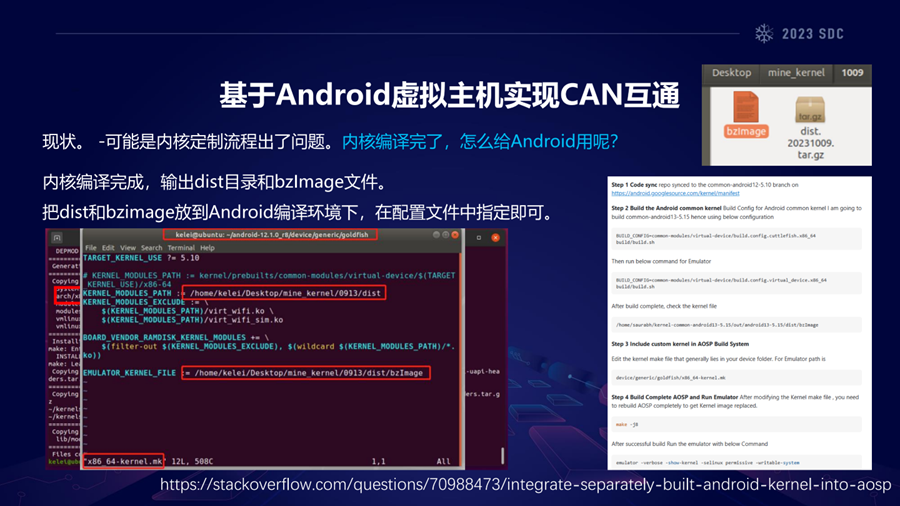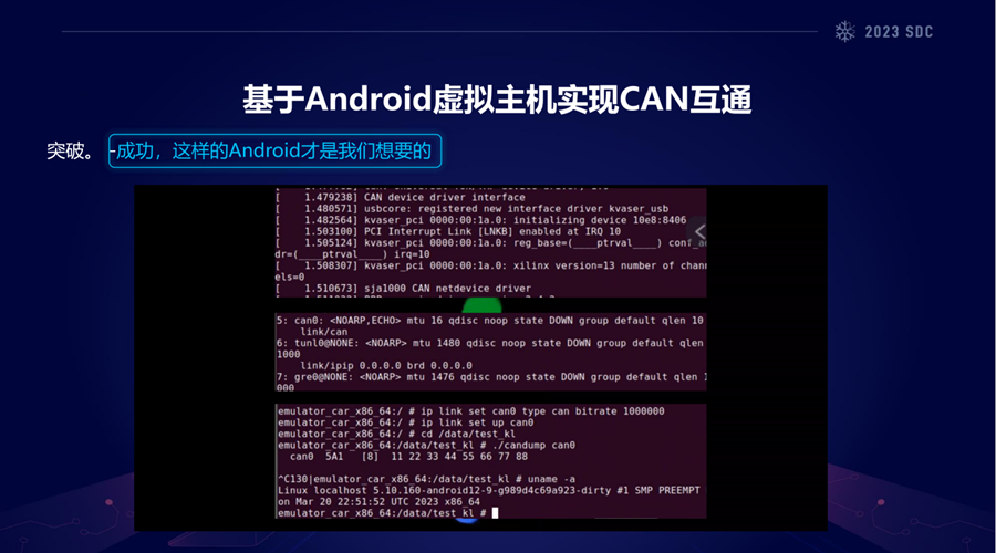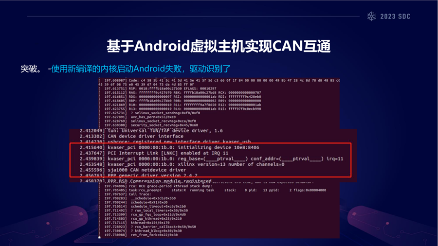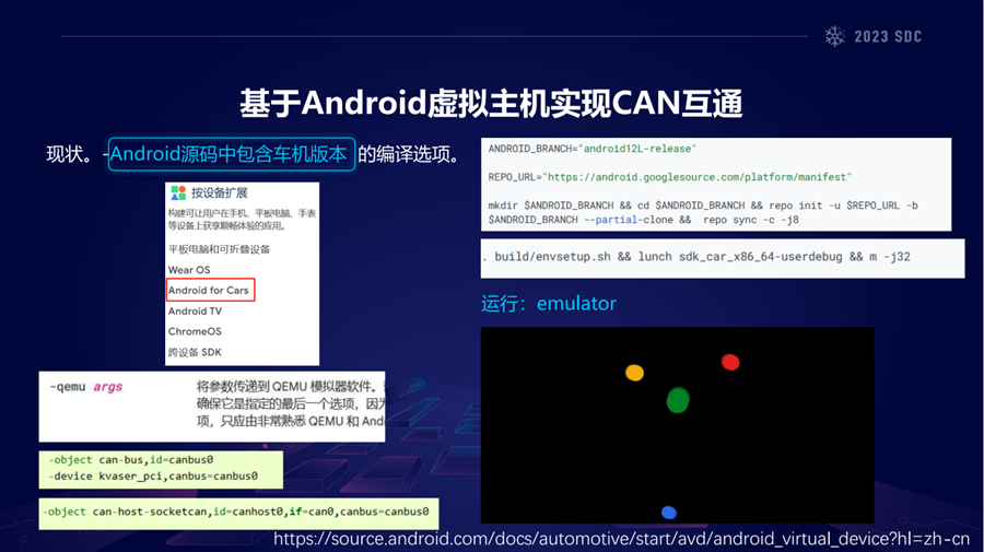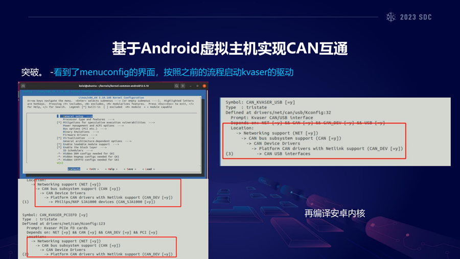 ECU的一个底座。我们需要编一下内核,然后根据VCU、T-box ADAS仪表网关这种零件类型,我们去给他定制文件系统。定制一些应用在里面,实现CAN的数据交互,这样能做好我们自己的零部件了。暂且放下,我们先去看看安卓系统是怎么使能CAN总线的。对于安卓而言,源码中说它包含一个Android for Cars。我们把安卓的代码下载下来,然后按照编官网的方式来把它编译,编译完了以后运行 emulator,确实可以启动一个安卓的操作系统,启动安卓的操作系统它没有任何参数,只有一个emulator。之前我们启动Linux的时候用了三个参数,使虚拟化的Linux支持CAN总线通信。按理来说,我们让安卓具备CAN总线通信功能的话,我们也得把这个参数加进去,我们查了官网,emulator 有个-qemu选项,把三个参数摆上去,就相当于做了之前的插入CAN虚拟网卡的操作。那我们用这三个参数启动Android。但是,得到的效果跟之前一样,它还是lspci下面有设备,但是ip addr中没有 SocketCAN那个接口,怎么办?我们就按照之前的解决方式来了一遍,我们找了一下官网内核怎么来编译,按理来说我们可以编译、定制内核。我们看下官网的流程,它会有一个build.sh一个脚本,按它脚本构建下来,一个标准的安卓内核就生成了,因为我们要定制它,所以我们还得找menuconfig,于是,我们在它的源码的目录下面翻到一个config.sh,直接运行,不加任何参数,就是menu configure,运行后menuconfig的界面就出来了,这就是我们想要的,我们需要这样一个界面去定制它的内核,把相应的接口SJ1000就是 kvser它的一个驱动,本质上的一个驱动,把它们都打开,打开完了以后我们再去编译安卓内核。但发现安卓依旧启动失败了。我们起安卓操作系统起了200秒还没有起来,内核里面报了一些错误。往上翻,找到一个很关键的,它识别了我插入的kviser