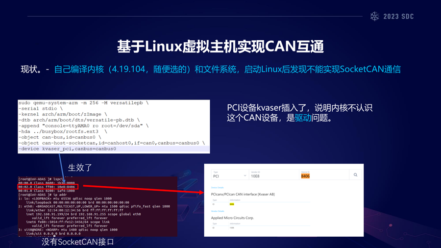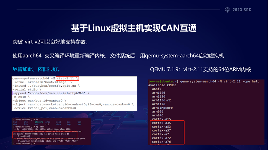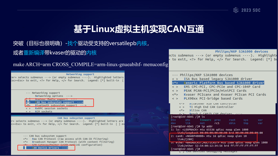vcan0、vcan1、vcan2这种。但是我们发现虚拟linux中没有,这个时候就会出现一些疑问。我明明已经把三个参数加进去了,但是它没有出现。然后我们在里面lspci,看下面有没有PCI设备的时候,发现它出现了。PCI设备插入了,说明内核不认识这个设备,我们内核不支持,解决思路有两个,我们找一个支持的,或者说我们自己编一个把驱动加进去。我们选择第二种,内核的编译过程就是先make menuconfig参数来去定制它内核的一些参数,比如说我去加载一些驱动进去,然后再make生成内核文件。驱动2013年度已经实现了,肯定在内核里面,找就完了。这些框全打勾就可以了。我们启动完了以后,can0就出现了。虽然很简单就实现了,但是不要高兴太早,因为它起arm虚拟机的时候用的主板只支持arm32位的,它不支持64位的处理器。大部分处理器都是64位的,怎么让它支持64位呢?最终我们测试发现,它有一个标准的虚拟化的主板叫VIRT,我们测试了一下,用virt-2.x是可以的,但是virt-3/4/5/6/7启动后没有can0,这个问题留给大家去解决。肯定是可以解决的,我没有深究。用qemu-system-aarch64把它启起来以后,它就是64位架构的,起起来以后它有一个can0说明是支持的,当然它不支持virt-3/4/5/6/7没关系,因为尽管如此,依旧很好。基于此,我们做好了Linux