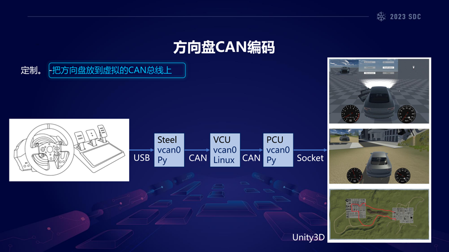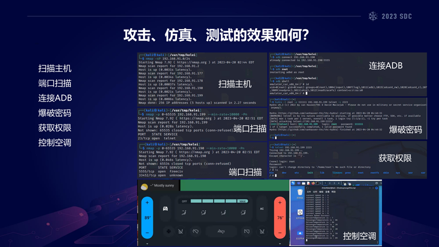 PCI的卡,这说明什么?说明我内核编译对了,问题出现在我们不懂这个内核如何给我们自己编译的安卓来用。安卓内核编译完了以后生成的两个东西,一个是bzImage,另外一个是dist,一个是文件,一个是目录。有一个网站说得把这两个产物,给编译环境来用,让你的编译环境用这两个东西来编译安卓系统。具体怎么做?就是在目录下编译一个文件,把我这两个文件还有目录给它指定了,再编译生成一个它就起来了。这样的安卓,它的内核是可以识别到CAN卡的,他启动完了以后跟我们一样也有一个can0接口。我们对can0做一些设置,比如设置他波特率是1000kbps,然后他把它起起来,在安卓里面用candump去抓包,我们在宿主就给他发包,宿主机发1233455667788,他就能收到。到此为止,我们安卓就具备了CAN通信的能力。总结一下,安卓多了一步,它不光要定制内核,还要把我们编完那些安卓内核的素材,重新给安卓的编译环境来用,重新编译完才能把它跑起来,否则内核和安卓的文件系统是不成一体的。我们再说CAN互联,Linux、安卓都能进行CAN通信了,宿主机一条命令也可以生成一条vcan网卡,这个时候我们怎么把这三个东西接进来,我们设计了一个结构,车机是安卓,adas控制器就是自动驾驶控制器,我们设置为Linux,T-box我们也设置为Linux,它分别具备CAN通信能力。每个里面都有can0。以下宿主机给他分配了3条卡,分别是接这三个虚拟化的设备。下面用emulator去启动车机,然后用qemu去启动ADAS和T-box,因为这俩都是Linux。以太网我们怎么做的呢?我们使用的桥接。任何一个虚拟化软件都是支持桥接的,我们构建了一个桥接网卡,三个主机桥接后,跟主机在一个网段,对于ADAS而言,我们在ubuntu去抓包,我们在ADAS shell中发包,我们发什么宿主机就能收到什么。下面也是,左边是T-box,右边是车机,最下面是宿主机,我们在T-box里面发,在车机里面抓包,在宿主机里面抓包,同样没有任何数据收发。到此为止,基于Linux和安卓节点互联的小型虚拟电气架构就做好了,基于它怎么形成一个虚拟的比较合理的汽车系统?既然是虚拟的汽车,还得有车。右边就是汽车的样子,它可以开车门开车灯,怎么才能支持开关车门的操作呢?我现在只有左下角所示可以发CAN报文的虚拟零部件。我们给它加了一个显卡,上面走unity3D把汽车的模子和路做好,现在只剩下了汽车怎么来控制。按理来说我们车是谁来控制?是汽车的虚拟化零部件来控制的。所以说我们给它加上方向盘和脚踏板,USB直接接电脑上就能使用的那种,但是我们不能直接用USB的数据,因为真实环境下汽车的动力控制也不是走的USB。所以说需要USB接进来了以后把它转成CAN通信,把CAN转到虚拟化零部件里面去。零部件发给前端的Unity3D,控制汽车的动力以及转向,比如说能开车门,踩油门控制它驾驶。整车的这么一个内部环境构造好了以后,我们一个整车的虚拟化环境也就做完了。车外的还有远程控制系统,APP小程序、安全云平台是绿盟的,具体就不给大家再做介绍了,大家自己实现一个ok就完了。还有个关键的地方,是方向盘的编码我们怎么做的。我们没有纠结方向盘的控制,到底是使用Python脚本,还是说是Linux C语言,其实本质上都是一样的,我们暂且用Python来去实现。宿主机上有一个can0网卡,我们把方向盘和脚踏板通过USB然后读出来,使用一个Python脚本,读完以后发到CAN总线上去。是发给谁?发给Linux的VCU,也就是整车控制器,他有控制转向和动力的能力。先用一个脚本将方向盘数据放到CAN数据报文中,比如设置其帧ID为0x123,数据字段包含8个字节,足以将方向盘和脚踏板的数据承载。最后我们设置PCU将CAN报文翻译为汽车的控制信号,比如方向、速度、刹车等等给到Unity3D的前端。到此为止,我们做好了方向盘,基本一辆车就可以驾驶了。小程序和云服务这些也很简单。大家梳理清楚相关业务以后自己做就可以。需要突破的难点,到此为止,基本上都解决了。我们看看它的攻击、仿真以及测试的效果.这个是个攻击的,右上角有一个攻击者,控制你的汽车,驾驶员利用方向盘驾驶。方向盘连接到宿主机上以后,通过刚才给大家介绍的网络去控制整辆汽车,它的数据流是方向盘的数据到了CAN1上,然后到了VCU上,最后就到了3D车路上,车就动起来了。而攻击者是利用一个路由器接进去了,路由器仿真的是一辆汽车的热点。因为里面都是做桥接的,所以每一个零部件的IP,攻击者都可以扫描到,这个是跟真车基本一致,有的可能会有一些网络层级,不在一个网段,但热点始终是在最底层,往上扫都是能扫到的,我们直接做桥接,不影响攻击效果。对于T-box、VCU和车机而言,攻击者如果是一个非常熟悉车联网安全的人,他会直接打VCU,因为VCU可以控车,这个时候他打进去以后会怎么做呢?他可以扫描主机,比如说我们用nmap在里面扫,可以扫描到一些IP存活。第二个是可以对每个IP进行端口扫描,扫描以后发现开了23端口,是telnet。然后还有另外一个主机,比如说91.190,我们扫到了4个5端口,5555端口就是安卓的APP服务.然后我们连接adb,运行adb root,就能获取root权限,这是一个标准的安卓的车机。下边密码爆破的是telnet。我设置的密码是root:111111。确实爆破到了弱口令。我们用现有的攻击工具像打一台主机一样打这个汽车零部件,真车也是怎么做的,我们这个虚拟化就怎么设计。所以说获取完权限以后,你基本上在里面都能控车了,比如下面那