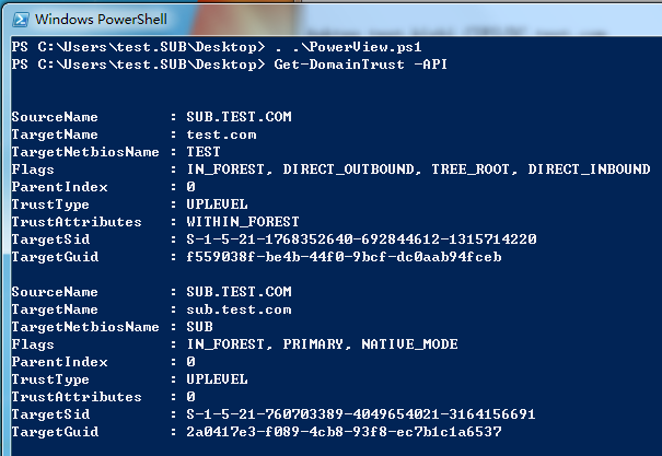 首先通过powerview在域内计算机(pc.sub.test.com)上使用普通域用户(sub\test)权限获取当前域和目标域的sid,如图7-13所示。