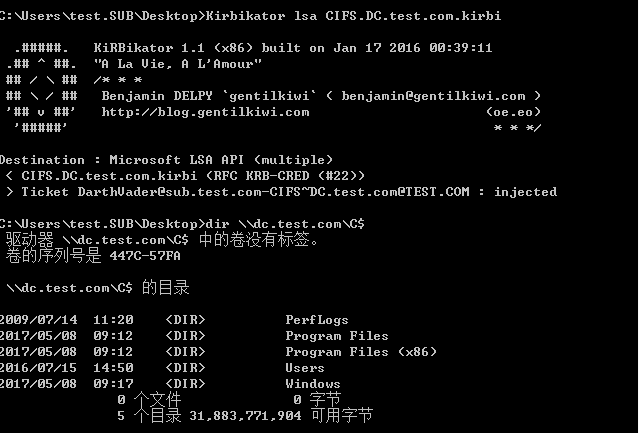 dir \\dc.test.com\C$图 7-12TGS票据注入到内存并访问目标服务
