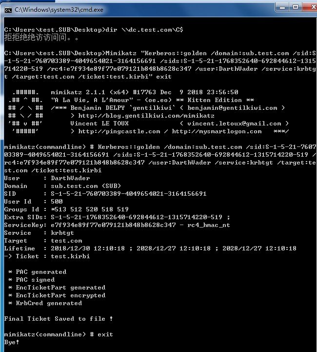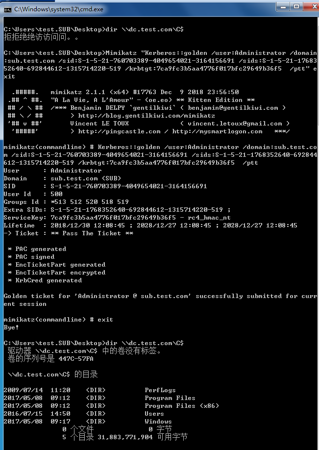 在子域内计算机(pc.sub.test.com)上使用普通用户权限(sub\test)构造并注入黄金票据,即可获取目标域的权限。命令如下。