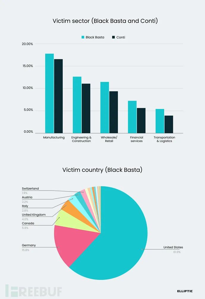 从报告来看, Black Basta 勒索软件团伙的大多数受害者从事制造业、工程建筑业和零售业。区域分布方面,61.9% 的受害者在美国,15.8% 在德国,5.9% 在加拿大。