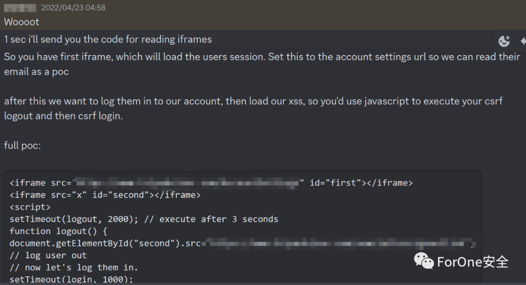 7.将在 iframe 1 中 iframe 受害者的帐户 A 详细信息,然后在iframe 2上将受害者注销,然后将受害者登录到已设置 XSS 的攻击者帐户!然后它会将第⼆个iframe的src设置为XSS位置,从⽽执⾏。由于XSS可以访问同源,iframe 2可以读取iframe1,从⽽泄露受害者的信息