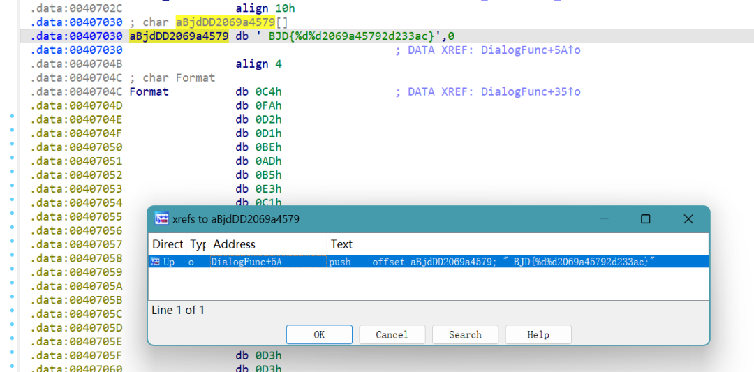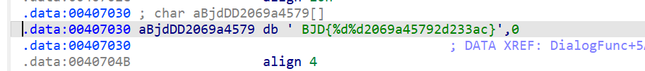 .data:00407030 aBjdDD2069a4579 db ' BJD{%d%d2069a45792d233ac}',0交叉引用