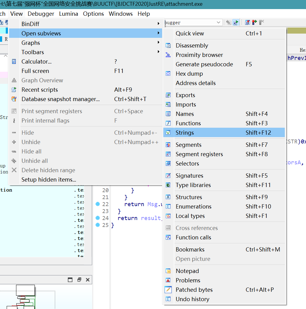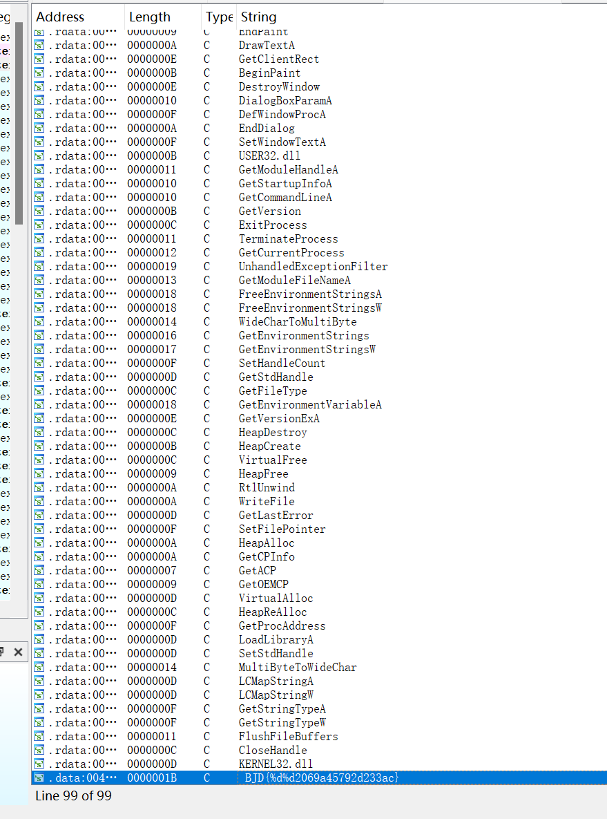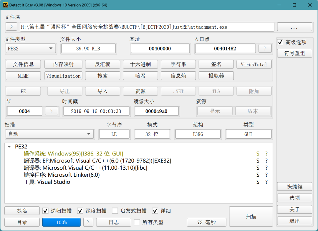 信息:文件名: H:/第七届“强网杯”全国网络安全挑战赛/BUUCTF/[BJDCTF2020]JustRE/attachment.exe大小: 40855(39.90 KiB)操作系统: Windows(95)架构: I386模式: 32 位类型: GUI字节序: LE