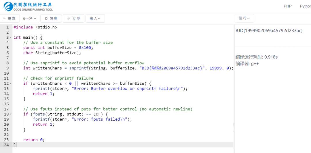 #include <stdio.h>int main() {// Use a constant for the buffer sizeconst int bufferSize = 0x100;char String[bufferSize];// Use snprintf to avoid potential buffer overflowint writtenChars = snprintf(String, bufferSize, "BJD{%d%d2069a45792d233ac}", 19999, 0);// Check for snprintf failureif (writtenChars < 0 || writtenChars >= bufferSize) {fprintf(stderr, "Error: Buffer overflow or snprintf failure\n");return 1;}// Use fputs instead of puts for better control (no automatic newline)if (fputs(String, stdout) == EOF) {fprintf(stderr, "Error: fputs failed\n");return 1;}return 0;}