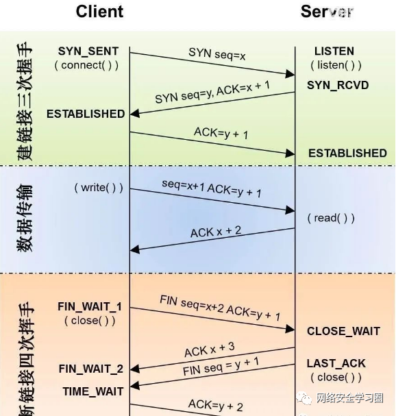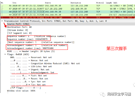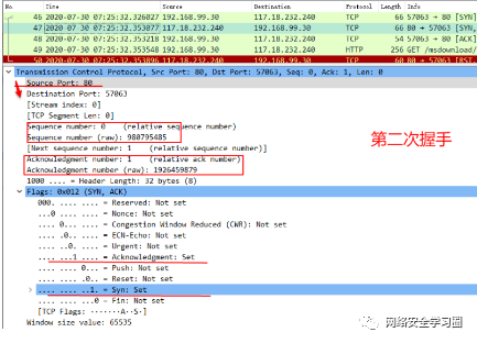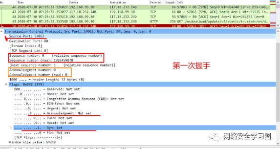 ▼点击下方图片搜索暗号【网络安全】,立即领取最新网安教程全家桶。1、TCP三次握手(1)第一次握手:客户端的端口为57063,服务器端口为80;客户端向服务器请求建立连接,发送其TCP数据报,数据方向