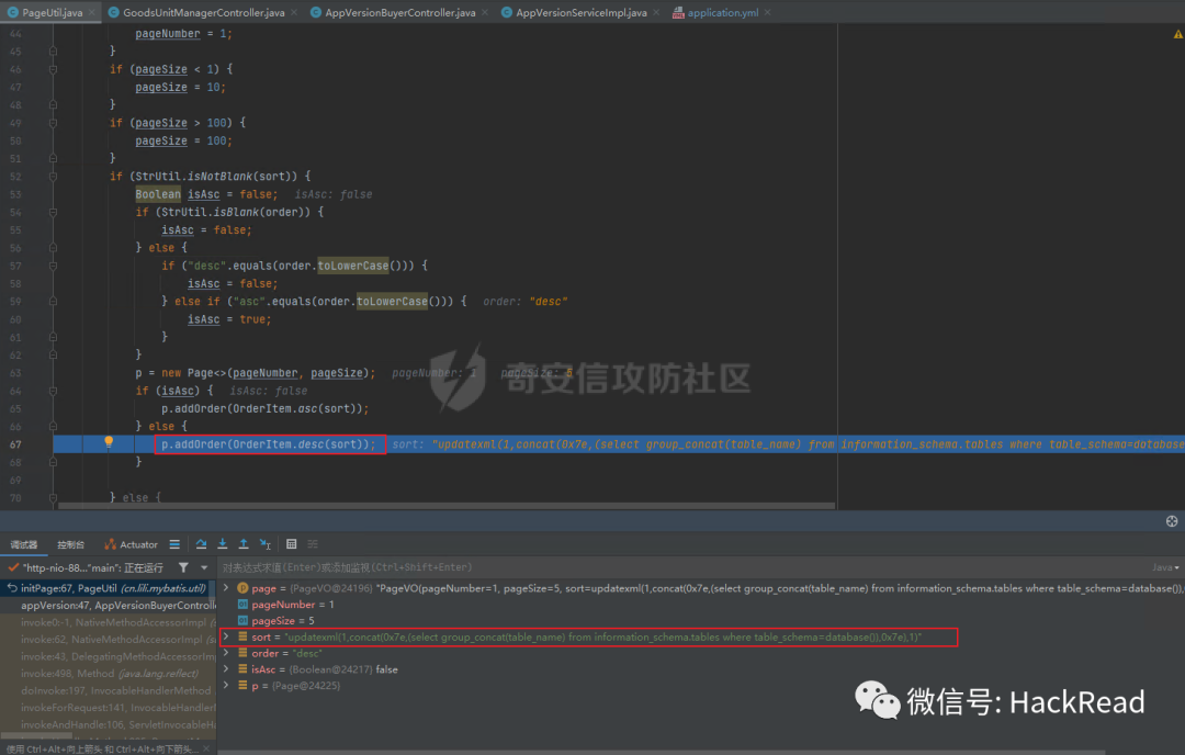 断点测试时,发现存在恶意的sort内容被保留,并在后续拼接到预编译SQL语句。