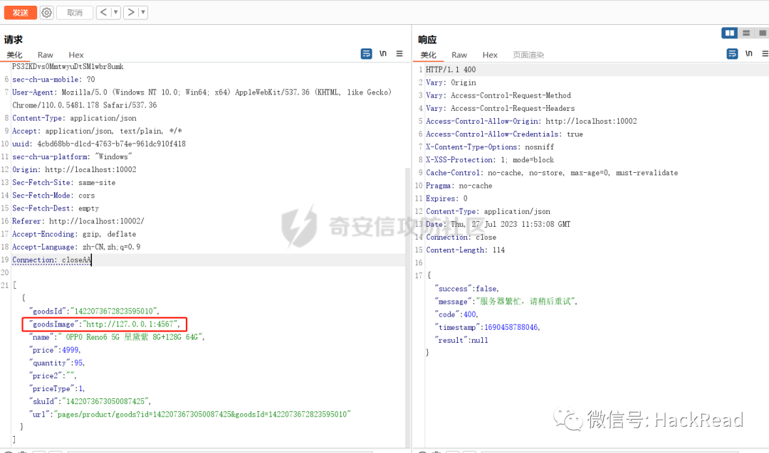 漏洞出现的原因是没有对数据包中的图片网络地址进行校验,构造了GET请求。从具体来看,这里只能执行HTTP、HTTPS的协议且没有回显,能利用的范围极其有限。
