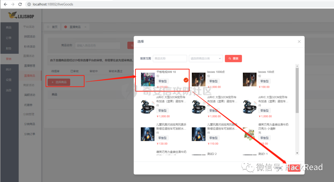然后进入卖家后台http://localhost:10002/liveGoods营销->直播商品选择添加商品,任意选择商品点击确定。