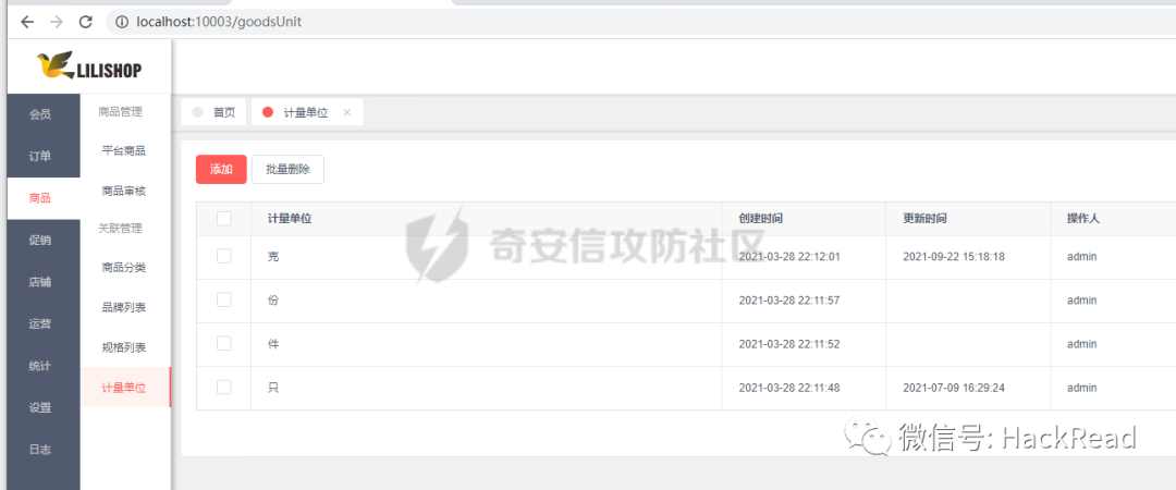 访问 http://localhost:10003/goodsUnit 登录后台并进入到商品->计量单位界面。