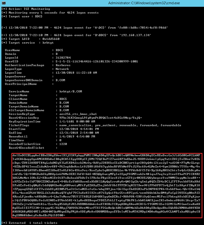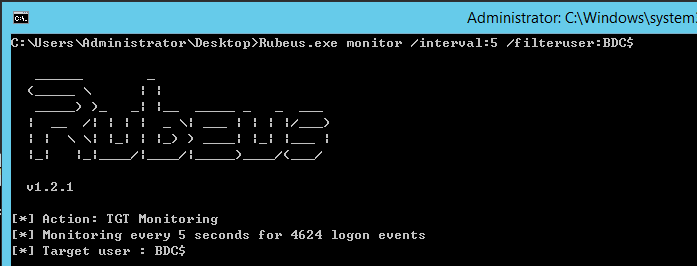 Rubeus.exe monitor /interval:5 /filteruser:BDC$图 7-19监控身份认证请求