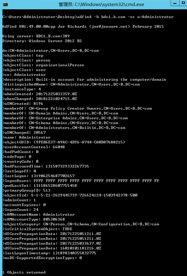 使用adfind工具可以获取信任域的完整信息,这里以获取Administrator用户的详细信息为例。输入下列命令,我们可以导出全部用户的信息,然后通过对比目标域和当前域的用户列表,查找同时加入了两个域的用户,尝试这些用户是否具有目标域的权限,如图7-17所示。