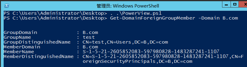 Get-DomainForeignGroupMember -Domain B.com图 7-18 列出加入目标域用户组的外部用户