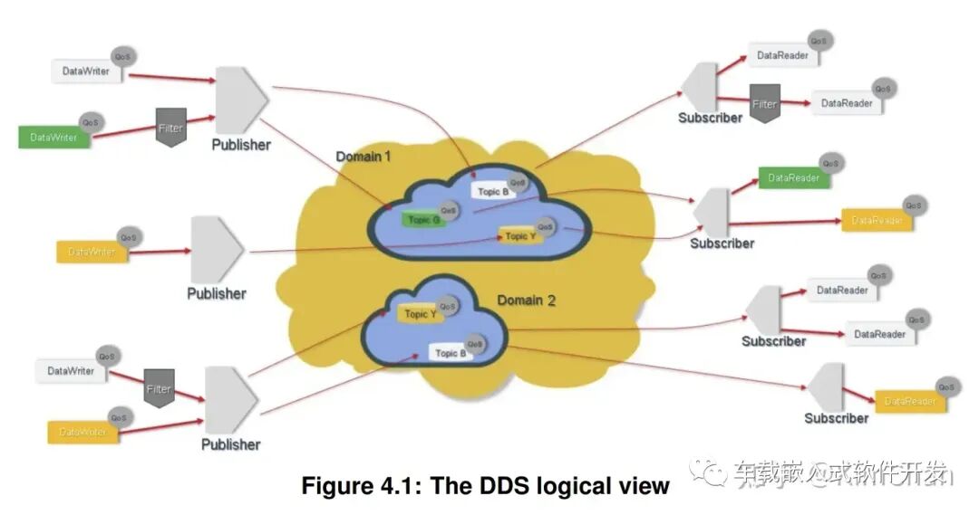 DDS提供了QoS控制的数据共享。应用程序通过发布和订阅主题(topic)来进行通信,主题由它们的主题名和类型来标识。订阅者可以通过时间和内容过滤器来获取主题上发布的数据的一个子集。不同的DDS域彼此完全独立。DDS域之间没有数据共享。