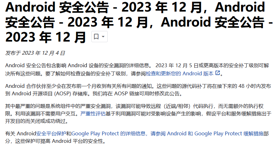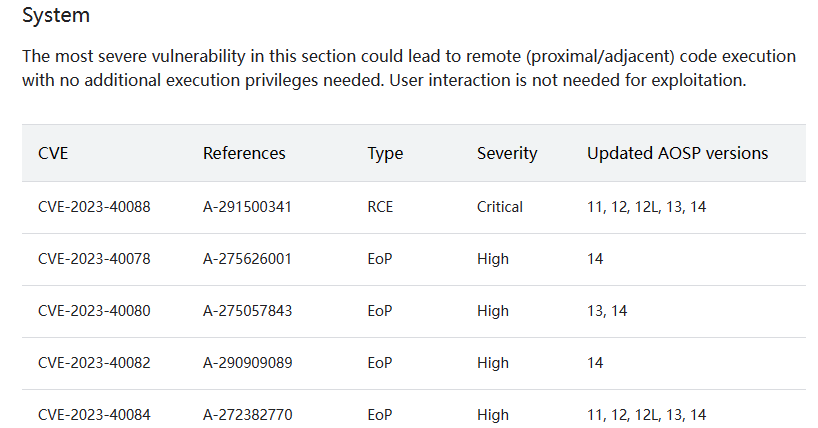 根据Android 开源项目 (AOSP)的公告,2023年12月的Android安全更新解决了85个漏洞,其中最严重的是一个零点击远程代码执行(RCE)漏洞。该零点击RCE漏洞(CVE-2023-40088)存在于Android的系统组件中,“零点击(Zero-Click)”意味着不需要用户交互给予额外权限就能被利用。