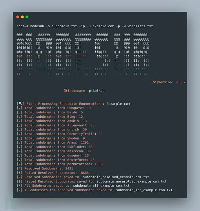 Nodesub是一款功能强大的子域名扫描与发现工具,该工具是一个命令行接口工具,可以帮助广大研究人员在漏洞奖励任务或渗透测试任务过程中完成子域名扫描方面的工作。当前版本的支持各种子域名枚举技术,并且提供了大量灵活的参数选项实现定制化任务执行。 功能介绍