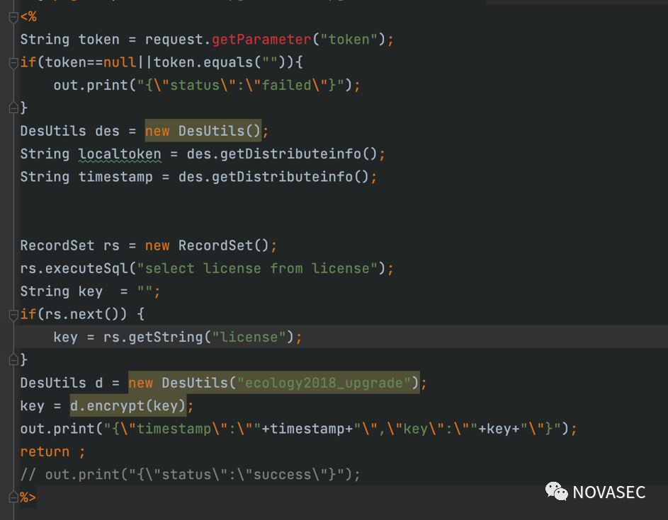 通过访问接口可获取到distributeinfo(timestamp值)和DES加密后的license(key值,DES密钥为ecology2018_upgrade)。