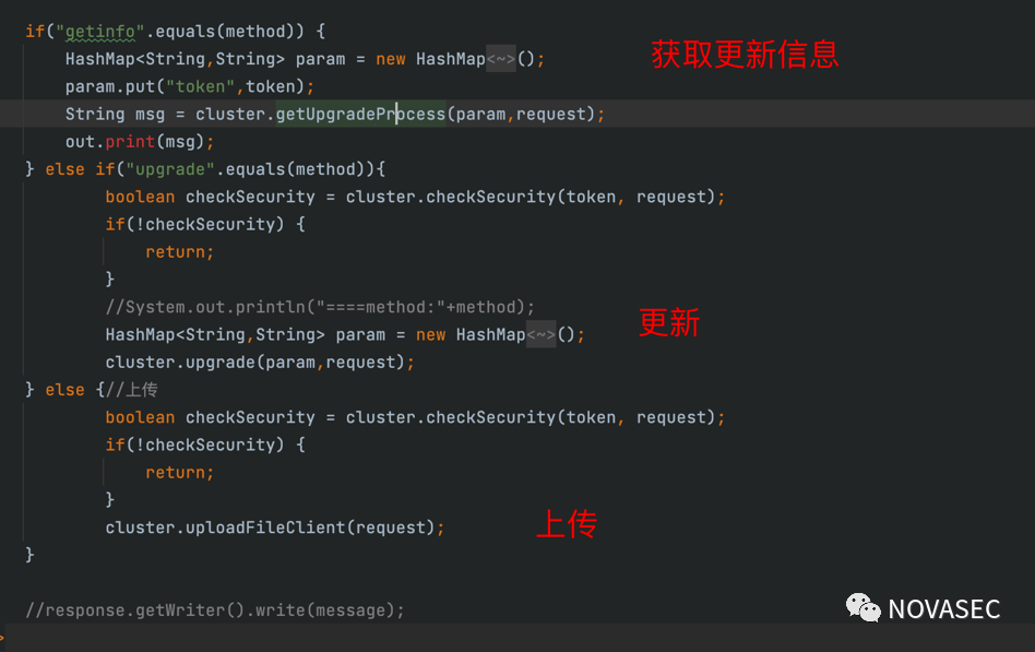 这里读取了method的值并根据不同的值进行不同的操作,看到这执行顺序盲猜应该是这样:上传-->更新-->获取更新信息