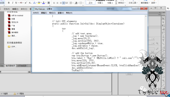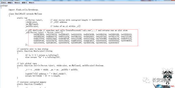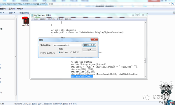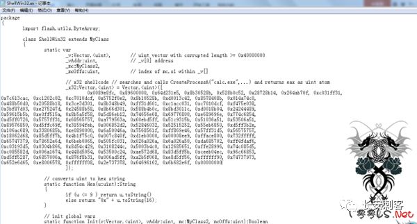 然后保存,ShellWin64.as的修改方法如上述,不再演示,下面我们来修改myclass.as,这里需要说明一下,因为此exp生成的利用程序,不能直接自动触发flash漏洞,也就是需要点击按钮才可以,实际上在做渗透的时候需要把它搞得更完美,所以就需要修改,修改方法:搜索myclass的某个字符doc.addchild(btn);如图: