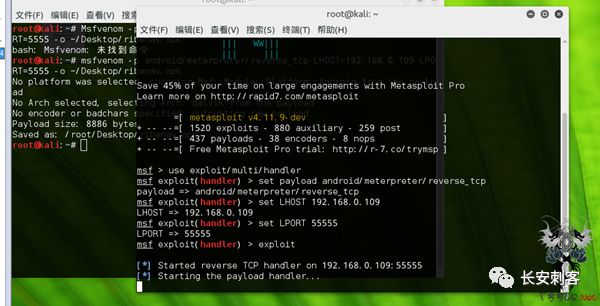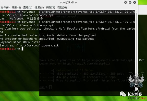 第五篇 msf+ettercap入侵邻居安卓手机首先启动msf先用kali生成一个安卓木马,如下命令: